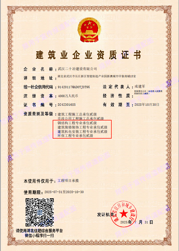 7月31日,武漢二十冶成功獲批鋼結(jié)構(gòu)工程、建筑裝修裝飾工程、建筑機(jī)電安裝工程、環(huán)保工程四項(xiàng)專(zhuān)業(yè)承包貳級(jí)資質(zhì)。