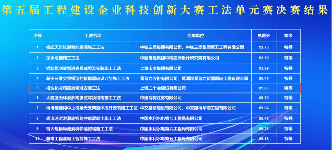 本次工程建設(shè)工法競賽共300個(gè)參賽項(xiàng)目進(jìn)入復(fù)賽,經(jīng)過激烈角逐,上海二十冶申報(bào)的“模塊化冷箱高效精準(zhǔn)安裝工法”入選決賽,最終憑借總得分89.85分的好成績,在決賽中位列第五,斬獲工程建設(shè)工法大賽特等獎(jiǎng)。